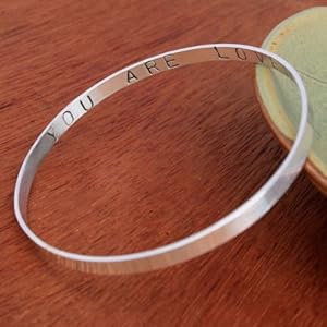 Hand forged sterling silver bangle with your secret message inside.This one says ?You are loved÷, but your bangle can be stamped with the message of your choice.A perfect gift for yourself or the one you love.Each letter is hand stamped and given a dark patina to make the letters pop.This bangle can be stamped with up to 22 letters.The bangle measures 4mm (1/8÷) with a 1mm (1/16÷) thick. It is 2 1/2 ? in diameter.Made with Nickel-Free Sterling Silver.Each Piece of artisan jewelry is handmade by Kira Ferrer in her studio on the island of Maui. Her work is inspired by the lush, natural beauty of the island. Her designs are created to enhance the beauty and individuality of the person who will wear them.